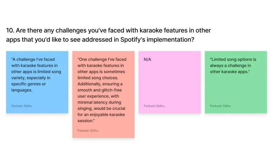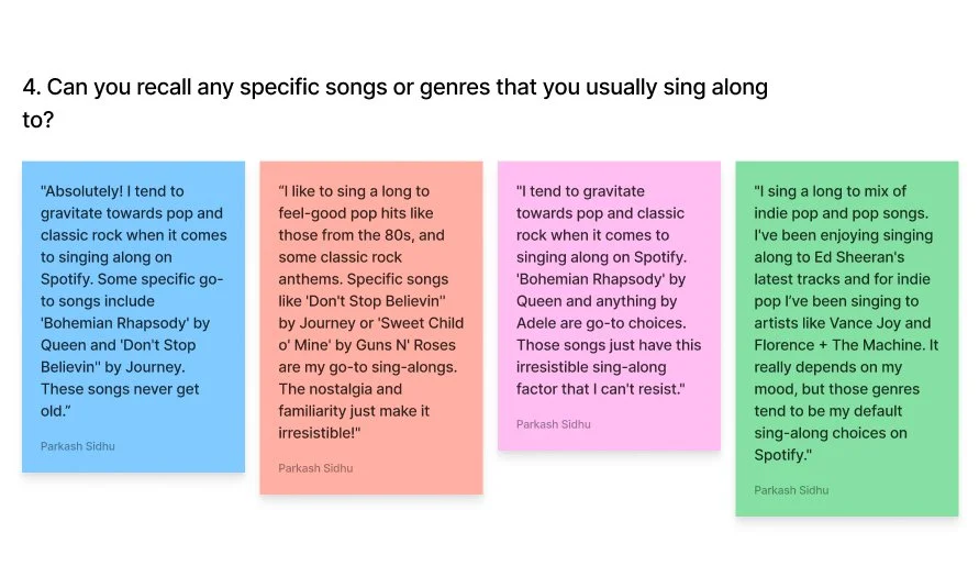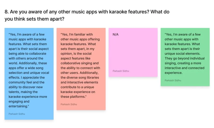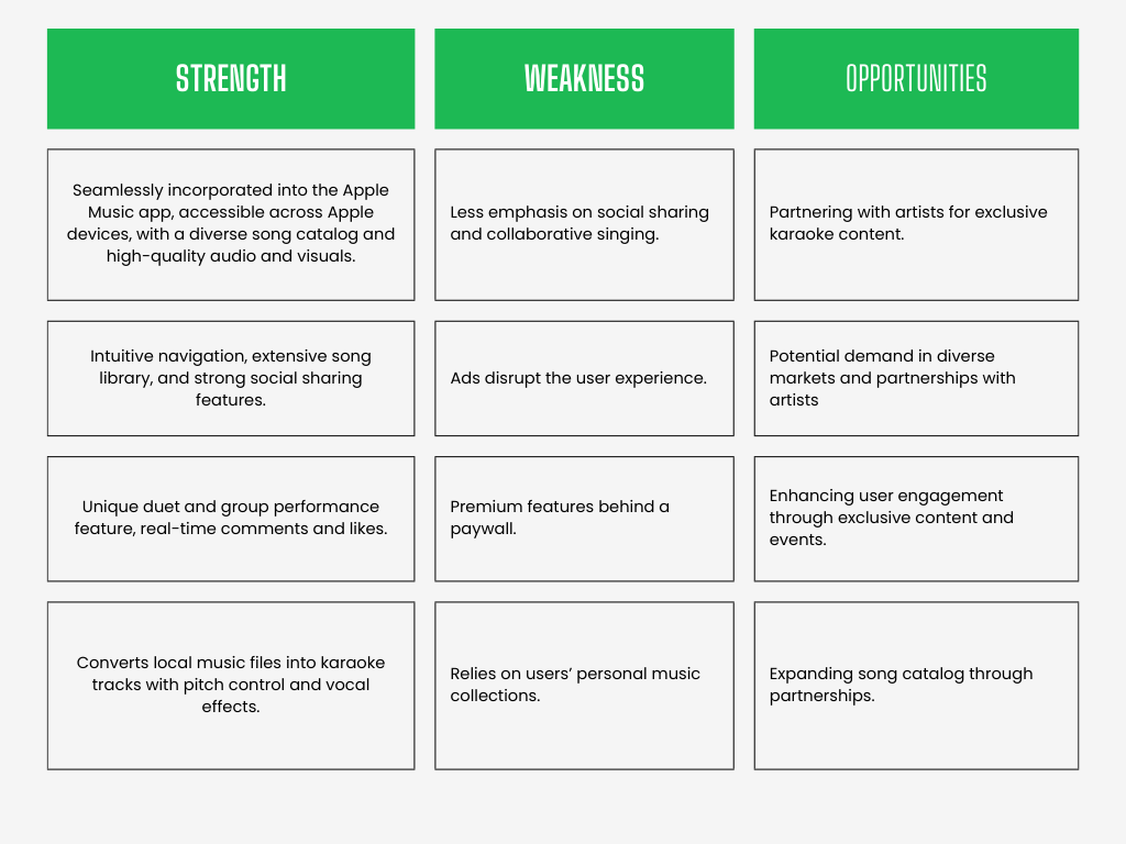 To better understand how other platforms engage users with interactive features, I conducted a competitor analysis. This helped uncover strengths, weaknesses, and potential opportunities to differentiate Spotify with a seamless karaoke experience.