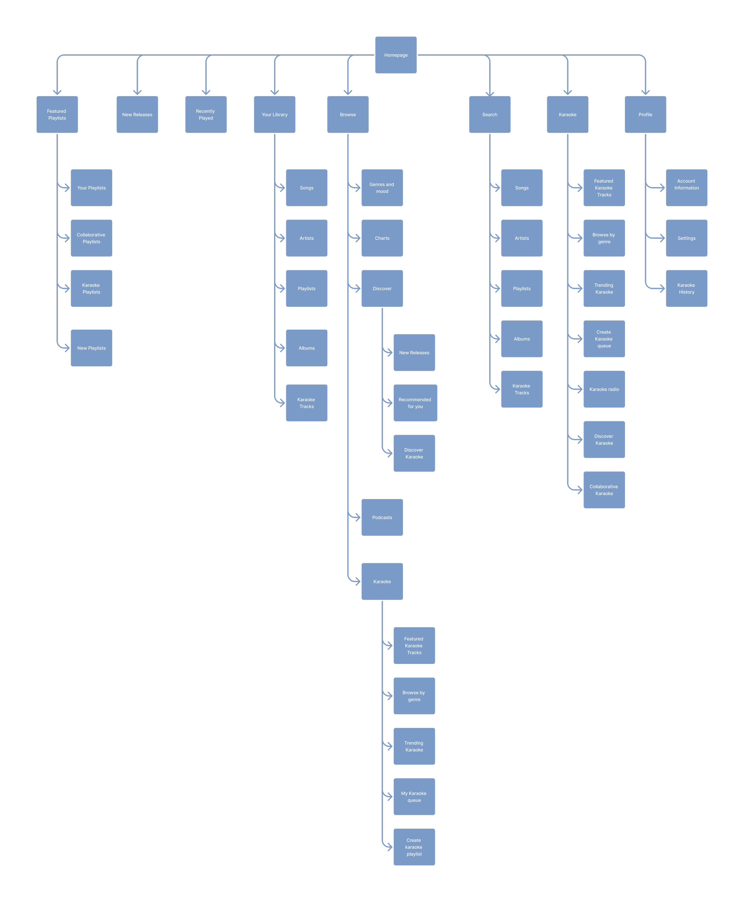 With a clear understanding of our user personas and their needs, the next step was to structure the app’s new feature in a way that ensures seamless navigation and accessibility. To achieve this, I developed a sitemap to outline the integration of the karaoke functionality within Spotify's existing framework, ensuring an intuitive and cohesive user experience.