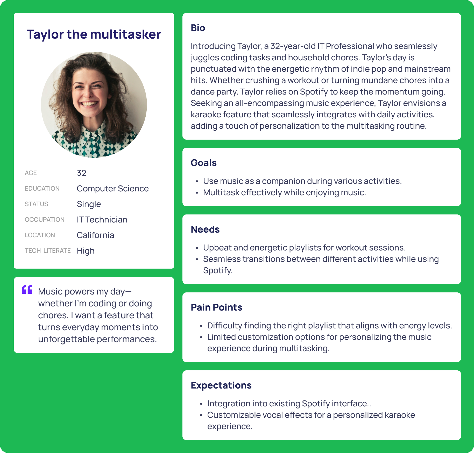 Building on the key insights from user interviews, I developed two user personas to fully represent the target audience. These personas highlight the goals, needs and pain points of users, serving as a foundation for creating a karaoke feature that enhances their engagement and aligns with their expectations.